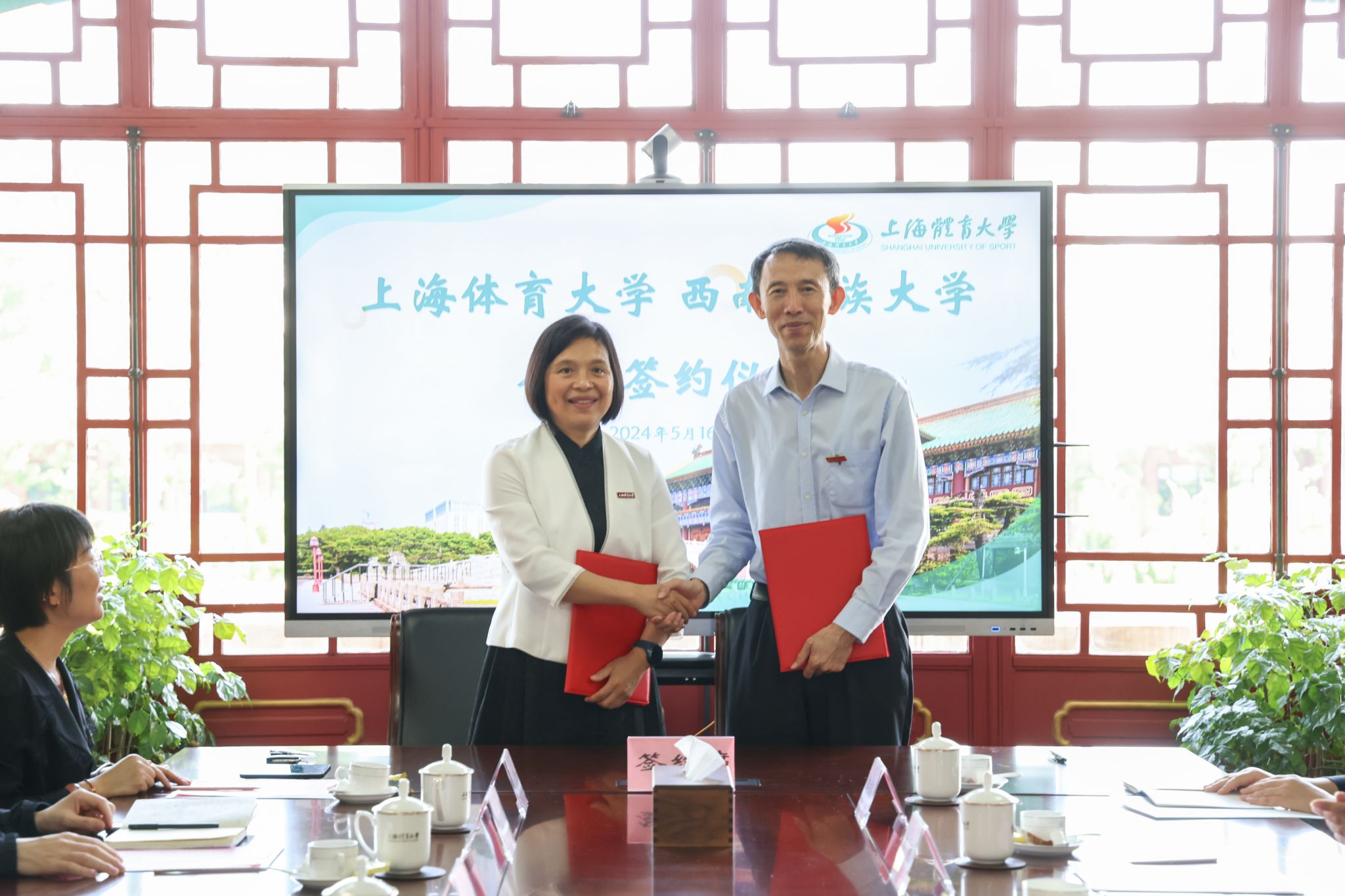为进一步推动体育与大健康学科交叉融合,助力服务高原人民健康领域研究高质量的发展, 5月16日上午,太阳成集团tyc7111cc与西南民族大学举行战略合作协议签约仪式。太阳成集团tyc7111cc党委副书记、董事长毛丽娟、校学术委员会主任委员陈佩杰、发展规划处、科研处、武术学院、太阳成集团tyc7111cc相关负责人参加本次仪式;西南民族大学党委副书记、董事长刘玉彬及相关职能部门负责同志出席仪式。签约仪式由公司党委副书记、经理王茹主持。